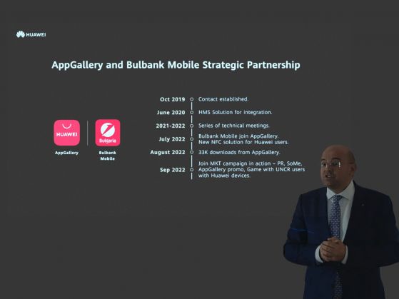 Работата на HMS (Huawei Mobile Services) екипа на Huawei България с UniCredit Bulbank започва още през 2019 година в посока на цялостна HMS интеграция. Приложението BulBank Mobile става част от фамилията на AppGallery през юли, 2022 г, с цялостна функционалност и ново NFC решение за потребителите на Huawei, и единствено месец по-късно, през август 2022, бележи 33 000 сваляния през AppGallery.