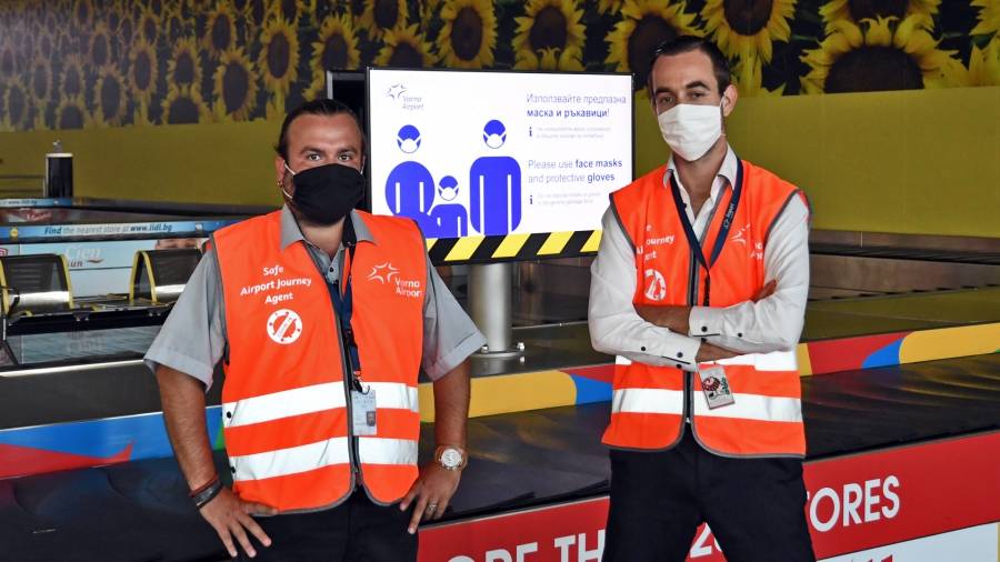 " Запознайте се с Агентите за безвредно летищно прекарване, Явор Каменов и Добромир Колев, които носят неповторими сигнални жилетки “Safe Airport Journey Agent ”, с цел да бъдат видяни от пасажерите, търсещи подпомагане и информация, и в същото време напомняйки за съблюдаване на трите Д-та: Дистанция, Дезинфекция и Дисциплина. ", изясняват от Фрапорт България.