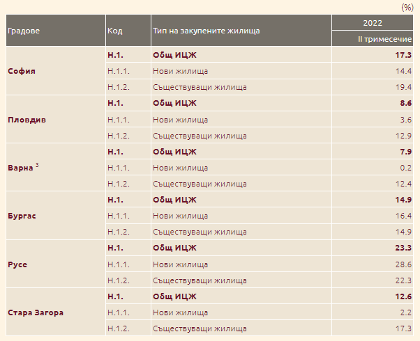 Ето и данните за придвижването на цените за второто тримесечие на 2022 годишна по отношение на същия интервал на 2021 година в шестте най-големи градове: