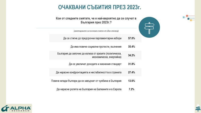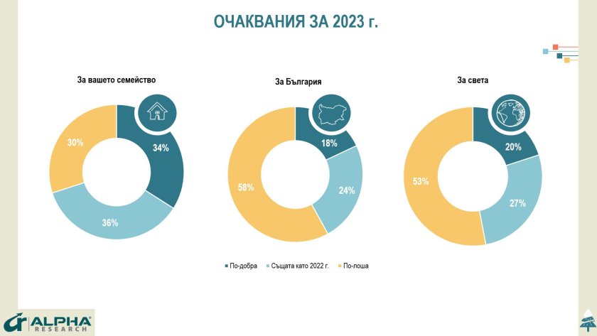 Ако отрицателните упования на персонално и световно равнище са сред 27% и 50%, то упованията за страната бият връх по скептицизъм – 58% чакат 2023г. да бъде по-лоша, едвам 18% се надяват на изцяло положително развиване.