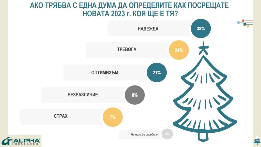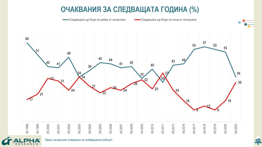 Разбираеми на този декор са песимистичните упования за 2023г. От 1998г., откогато " Алфа Рисърч " следи този знак, равнището на персонален оптимизъм (34%) е третото най-ниско след икономическата рецесия от 2009 -2011г. Дори и в бурните политически 2016-2017, даже по време на Ковид пандемията от 2020, обичайният новогодишен оптимизъм и готовност на българите не са спадали под 50-55%. В края на 2022 те обаче бележат срив от 20 процентни пункта.