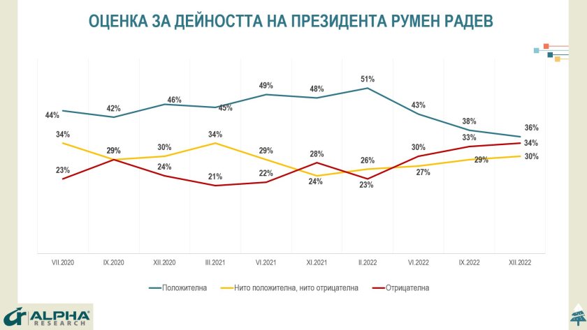 Макар да резервира позицията си на най-одобрявана политическа фигура, рейтингът на президента Румен Радев също ерозира. Причина за това е борбата с партиите, както и нетипичната за президентската институция отговорност за дейностите на изпълнителната власт. За първи път от избирането на Радев на този пост ножицата сред доверие и съмнение се затваря до два пункта. От началото на втория му мандат през февруари до декември позитивните оценки спадат от 51% до 36%, а негативните нарастват от 23% до 34%. Подкрепата си за президента отдръпват поданици на регионалните градове, младите и междинни генерации.