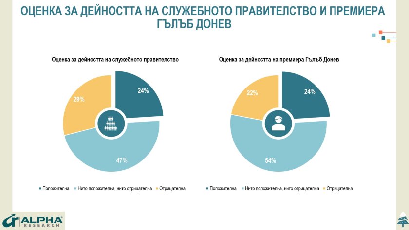 Отношението към назначеното от президента четвърто служебно държавно управление е мощно поляризирано. Кабинетът получава утвърждение от 24% и отрицание от 29%, а служебният министър председател Г. Донев – 24% утвърждение против 22% отрицание. Мнозинството от членовете на кабинета и тяхната активност са непознати и всеки втори пълновръстен българин не е в положение да изрази мнение за работата им.