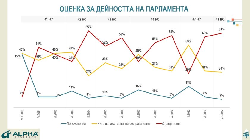 Сформираното след вота през октомври 48-о Народно заседание е първото, което започва активността си с минимално публично доверие от 7% против 63% съмнение. За последните 13 години сходно отношение е записано само в края на 42-ро Народно събрание, излъчило държавното управление на П. Орешарски (8% доверие против 65% недоверие).