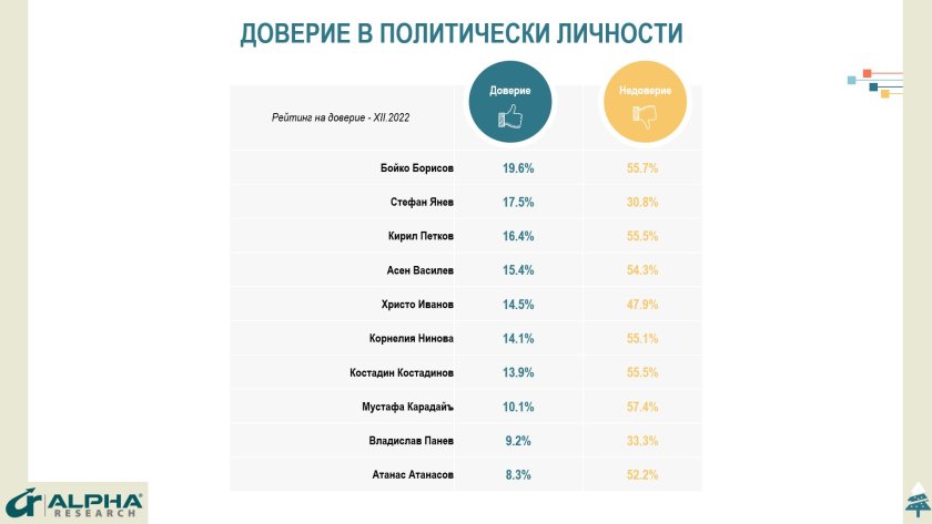 * Данните са от национално представително изследване, част от регулярния мониторинг на Алфа Рисърч. Проведено е в интервала 1 – 13 декември 2022 измежду 1023 пълнолетни жители от цялата страна, посредством директно стандартизирано изявление с таблети. Използвана е двустепенна стратифицирана по район и вид обитаемо място извадка с квота по пол, възраст, обучение. Публикувано е на уеб страницата на организацията и се осъществя със лични средства.