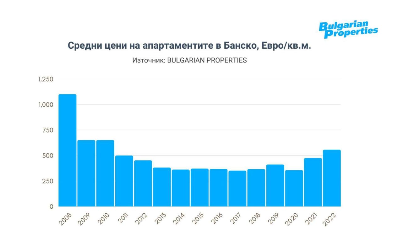 Средната цена на парцелите в Банско за 2022 година е 555 евро/кв.м., като през последното тримесечие на годината Bulgarian Properties регистрира междинна цена 685 евро/кв.м. Средната цена на закупените жилища доближи близо 50 000 евро. Това са най-високите цени от 2010 година насам.