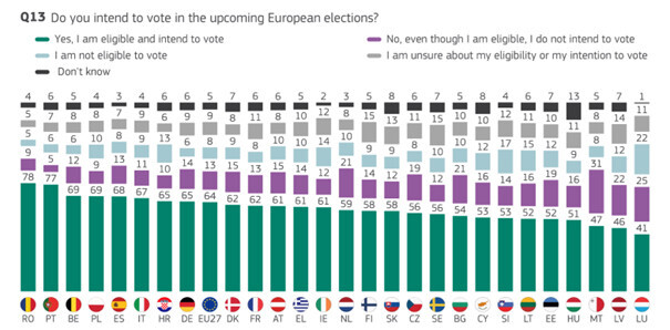 38% от европейските младежи вярват, че присъединяване в изборите е най-ефективният метод да бъде чут гласът им. Около 19% заявяват, че не се интересуват от политика, а 13% няма да гласоподават.