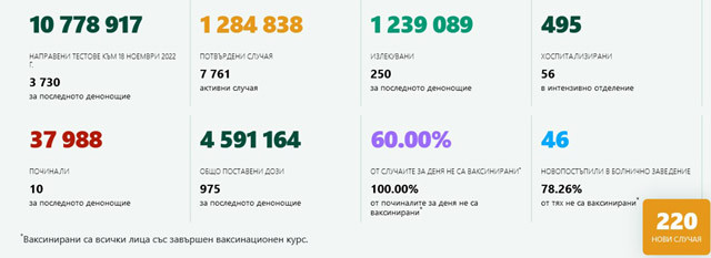 220 са новите случаи на Коронавирус, демонстрират данните на Единния информативен портал за развиването на болестта на 17 ноември 2022 година Направени са 3730 теста, а инфектираните са 5,9% от тестваните.