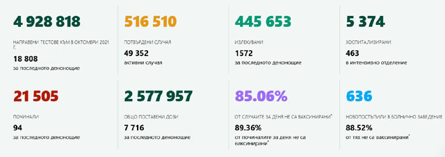 2302 са новодиагностицираните с COVID-19 лица у нас за миналите 24 часа. Това са 12,2% от направените общо 18 808 теста, от които 5209 PCR, а 13 599 - антигенни, сочат данните в Единния информативен портал. Починалите са 94, като 89,36% от тях не са имунизирани. 85,06% от новите случаи са на хора без имунизация, в болнични заведения сега са 5374 души, от които 463 в интензивни отделения. Новопостъпилите за лекуване за денонощие са 636, като 88,52% са без имунизация. Оздравелите за последните 24 часа са 1572, общо 445 653 души от началото на пандемията. Официално доказаните случаи на COVID-19 у нас са 516 510, от тях 49 352 са дейни. Починалите до момента са 21 505.