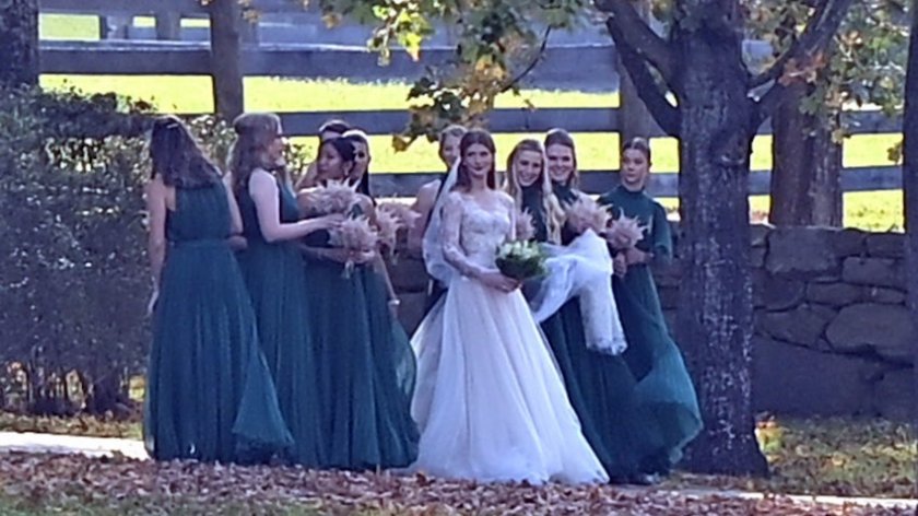 Булката носеше сватбена рокля от дизайнера Уанг, а шаферките бяха облечени в тъмнозелени рокли.
