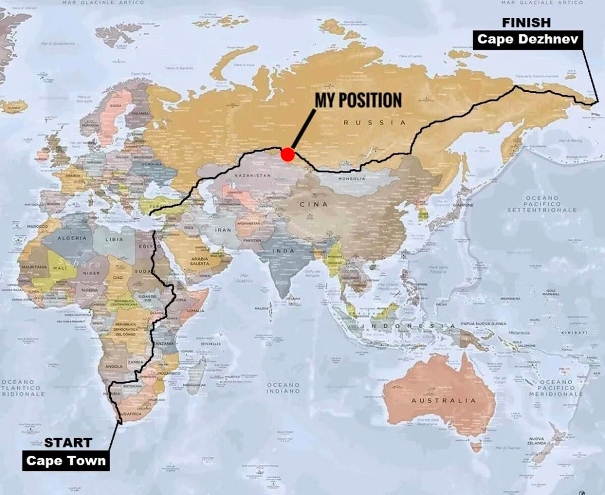 При първото му премеждие през 2020 година, когато прекосява Сибир посред зима, от време на време спи в палатка при температура -55°C! Сега той е поел ново предизвикателство: през февруари е тръгнал от Иглен нос, най-южната точка на Африка, а дестинацията му е нос Дежньов в Чукотка, най-източната точка на Азия. По пътя си ще прекоси 12 страни на 3 континента и ще измине общо 29 000 км на колело!