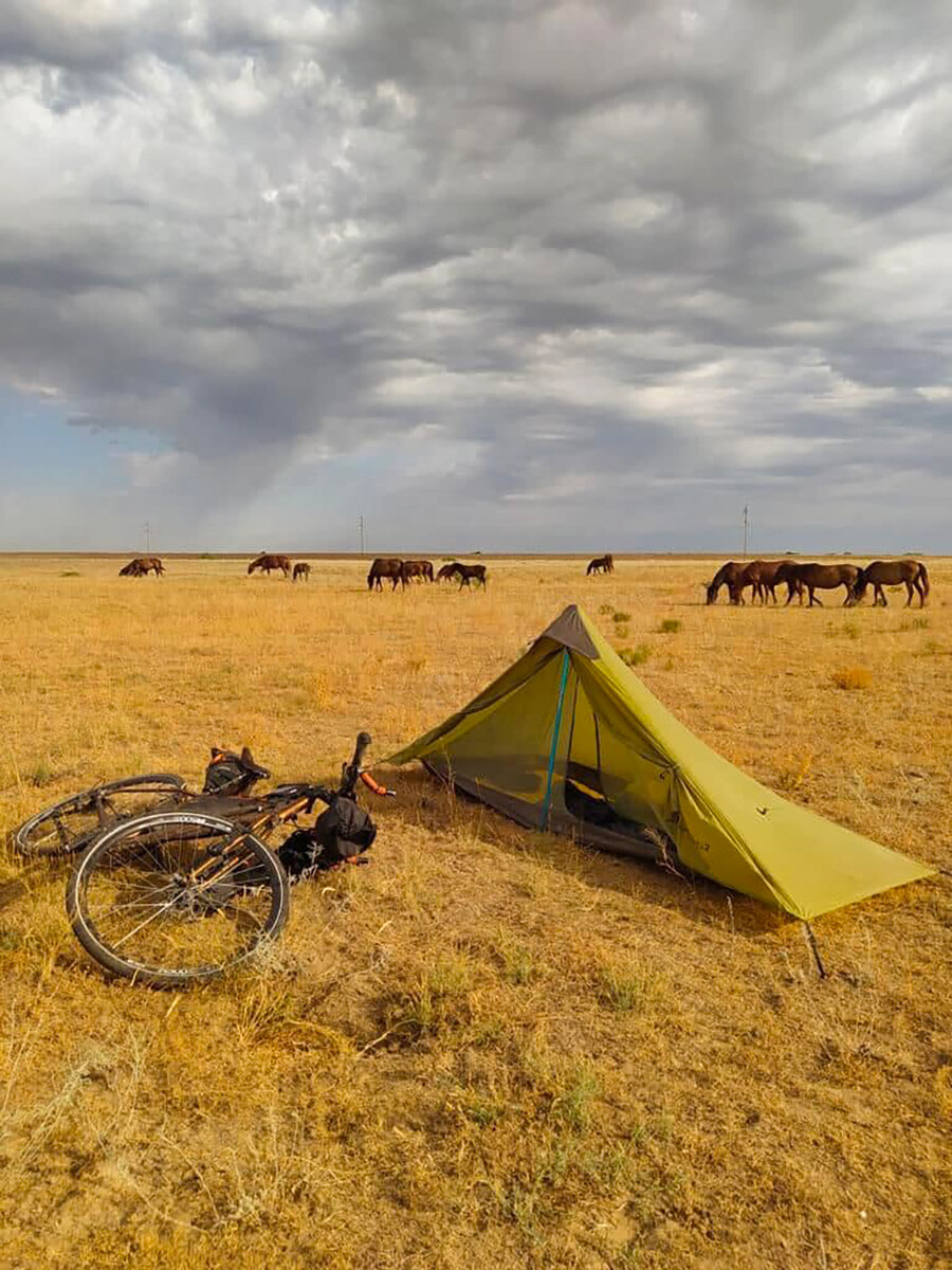 През последните няколко дни срещнахме и няколко колоездачи; не бях срещал от Кападокия в Турция и беше хубаво да споделя прекарвания и информация с тях. Вчера напуснахме дивите гори и в този момент стартира степта. Границата с Монголия към този момент е близо “.