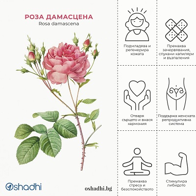 „ Кралицата на цветята “, както е известна розата, се смята и за „ кралицата измежду маслата “ в света на ароматерапията. Българското розово масло от маслодайната роза дамасцена е най-търсеното и най-високо цененото от всички типове и райони в света, заради богатия и комплициран мирис, който го характеризира. Това скъпо етерично масло се свързва най-много с въздействието му върху сърцето и прочувственото тяло. Повдига, отпуска нервната система, успокоява и хармонизира, подтиква възприятието за обич. Влияе благотворно на кожата, заради което е доста известно като съставна част в козметичната промишленост.