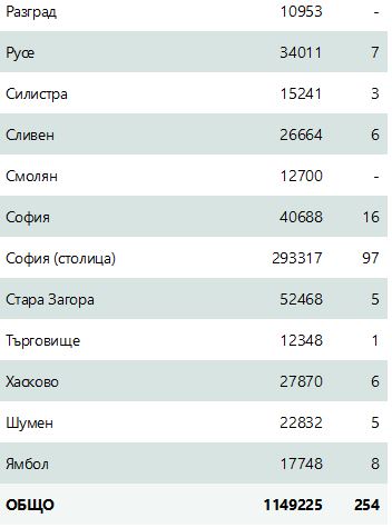 Разпределението по области по сегашен адрес на лицата е: Благоевград - 5; Бургас - 14; Варна - 17; Велико Търново - 8; Видин - 7; Враца - 8; Габрово - 4; Добрич - 0; Кърджали - 4; Кюстендил - 7; Ловеч - 0; Монтана - 1; Пазарджик - 5; Перник - 0; Плевен - 5; Пловдив - 15; Разград - 0; Русе - 7; Силистра - 3; Сливен - 6; Смолян - 0; София област - 16; София град - 97; Стара Загора - 5; Търговище - 1; Хасково - 6; Шумен - 5; Ямбол - 8.