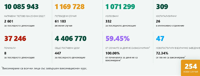 254 са новозаразените с ковид, което е с 66 случая по-малко от през вчерашния ден. Това демонстрират данните на единния информативен портал.