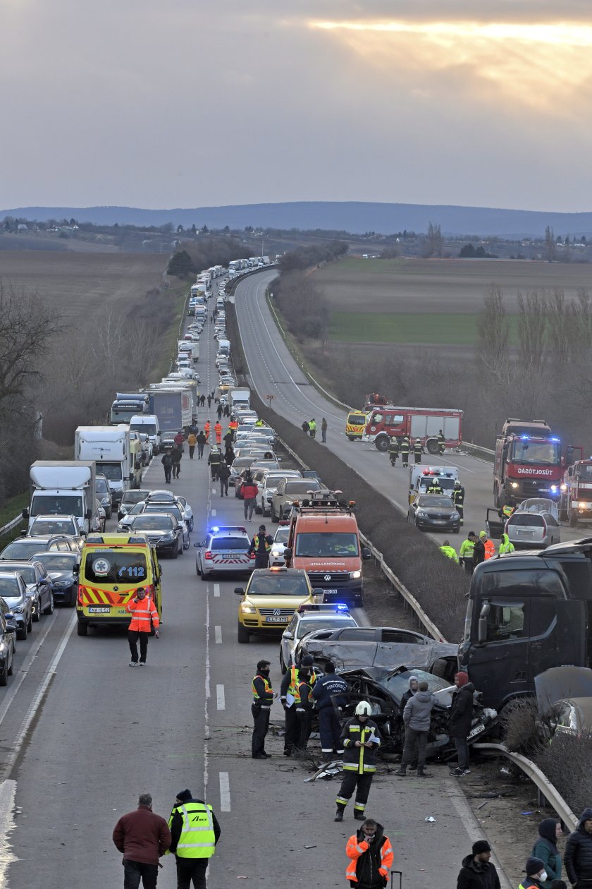 Пет камиона и 37 коли са се сблъскали на автомагистрала в централната област Пеща.