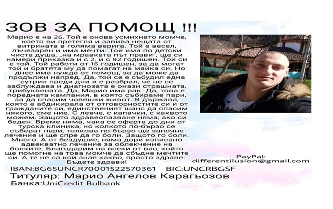 " Марио е извънредно момче - радостен, сияен и " на мравката път прави ". Ще си откри приказка и с 2 годишно, и с 92-годишен. Още от 16 години работи, с цел да може дружно с братята му да оказват помощ на майка им. Сега обаче той има потребност от помощ ", разказват го неговите познати.