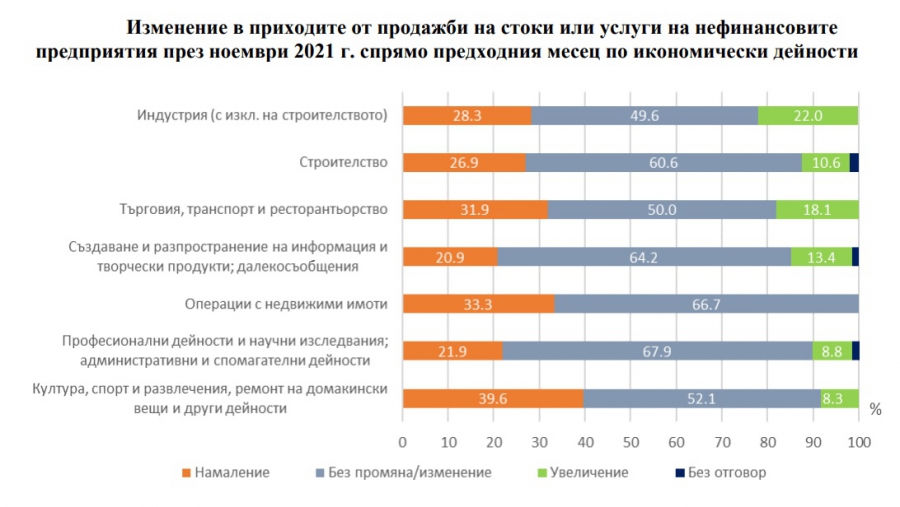 Данните показват известно икономическо възобновяване, защото преди година понижение в приходите си от продажби по отношение на предходния месец октомври 2020 година са отчели 41.7% от компаниите, 46.1% не са записали смяна, а едвам 11.8% са нараснали постъпленията от продажби.