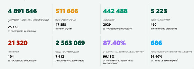 Пациентите с потвърдена коронавирусна зараза, настанени в болница, са общо 5223. От тях 460 се намират в интензивни отделения и клиники. Дозите от имунизациите против COVID-19, сложени у нас досега, са общо 2 563 069. През миналото денонощие са приложени 7412 от тях. Починалите лица, при които е била доказана коронавирусна зараза, са 21 320. 104от тях в последното денонощие. Процентът от умрелите за деня, които не са имунизирани, е 96.15% за последното денонощие.