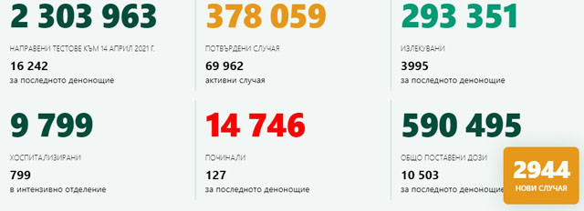 Общо 590 495 са поставените у нас дози от 10 503 от тях са сложени през последното денонощие. Според Националната осведомителна система медицинските чиновници, при които е доказан новият ковид у нас, са общо 12 670. Нови 82 случая са регистрирани през последните 24 часа. Починалите лица, при които е била установена коронавирусна зараза, са 14 746. През миналото денонощие са регистрирани нови 127 случая. Седмицата стартира с на COVID-19, а седем дни по-рано новодиагностицираните у нас