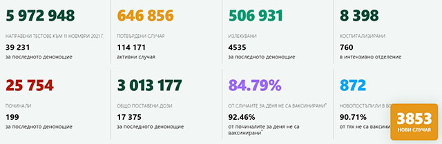 Общо 3 013 177 са поставените у нас дози от имунизациите против COVID-19 все още. 17 375 от тях са приложени през последното денонощие. Националната осведомителна система демонстрира, че у нас новият ковид е установен при 16 512 лица-медицински чиновници. 77 нови случая са регистрирани през последните 24 часа. Единният информативен портал демонстрира, че за миналото денонощие са умряли 199 лица с потвърдена коронавирусна зараза, а от началото на пандемията жертвите са към този момент 27 754. Ден по-рано новодиагностицираните с COVID-19 лица у нас бяха 4955, а преди седмица, в сряда - 4922. Източник: dnesplus.bg