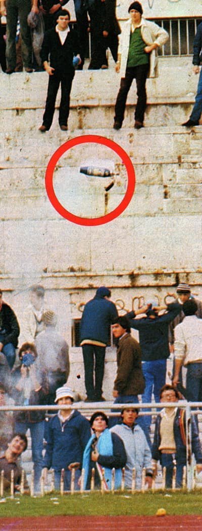 Третата ракета, изстреляна от почитателите на " джалоросите ", попада право в лявото око на Винченцо Папарели, който се свлича незабавно на земята, а от окото му стартира да се лее кръв и мъжът изпада в безсъзнание.