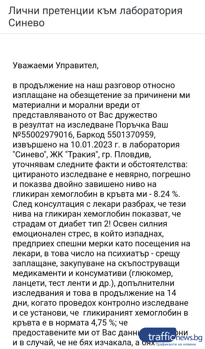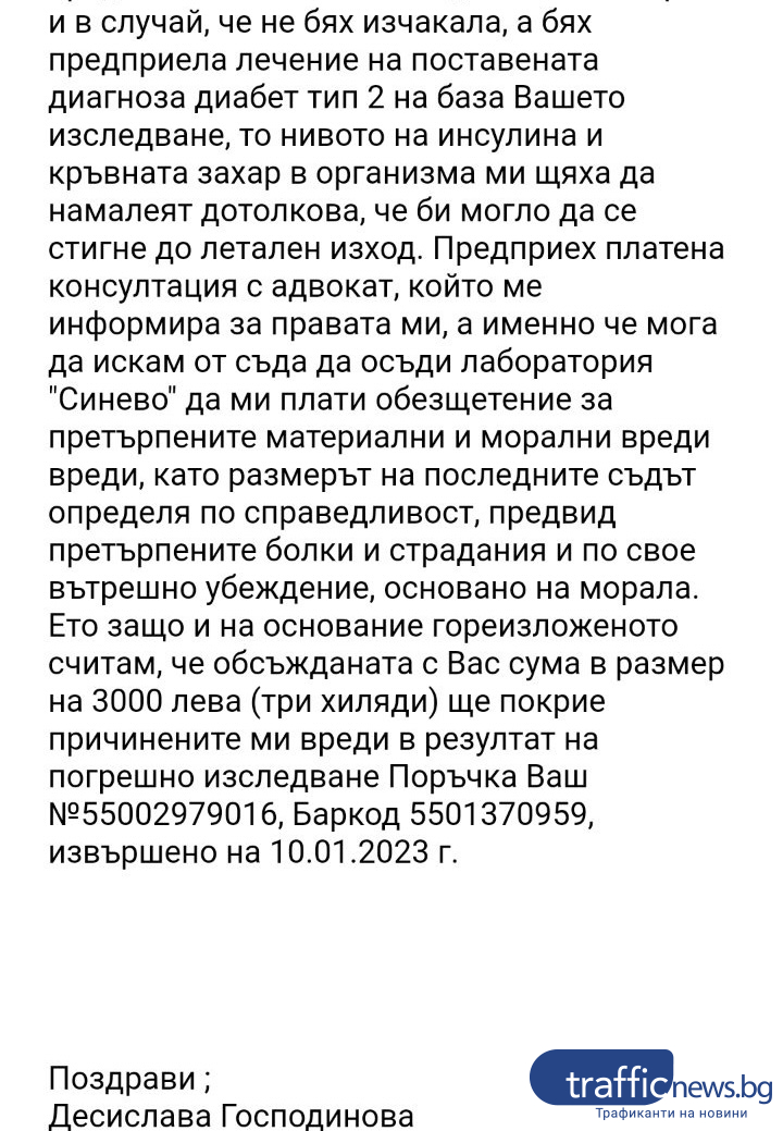 Жената обаче не се е съгласила, защото 300 лв. не са даже и една трета от разноските, които е похарчила за последвали проучвания, съвещания и закупуване на медикаменти след излизането на неверните резултати.