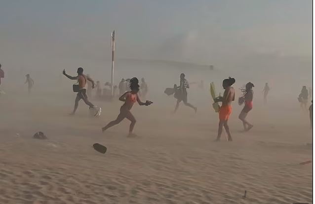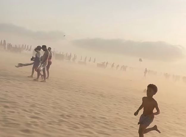 На фрагментите се вижда, че мощните ветрове издигат облаци пясък и принуждават чиновниците на плажа да сгъват кърпи и чадъри. Столовете и масите на терасите или в градините се летят в разнообразни направления.