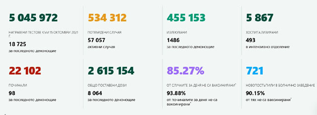 3183 са новодиагностицираните с COVID-19 лица у нас за миналите 24 часа. Това е със 144 случая по-малко от през вчерашния ден, сочат данните на Единния информативен портал. За последното денонощие са направени общо 18 725 теста. Това значи, че новите случаи са 16,99 % от тестваните. 5 867 души са приетите в болница, а 493 от тях се намират в интензивно поделение. Общо доказаните случаи на ковид досега са 534 312. 57 057 са дейни. 455 153 е броят на излекуваните, 1486 през последното денонощие. Броят на умрелите е 22 102, а 98 са за последните 24 часа. 2 615 154 са общо поставените дози ваксини у нас. 8 064 са за последното денонощие.