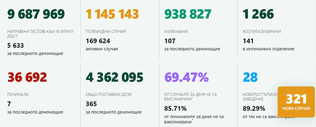 Общо 1 145 143 са доказаните случаи на новия ковид у нас все още. 169 624 от тях са дейни. 938 827 са излекуваните лица, 107 от които са регистрирани през миналите 24 часа.