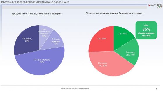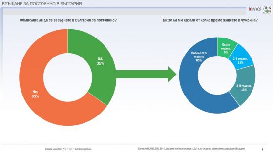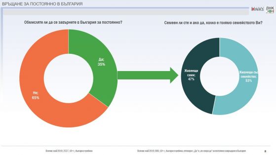 35% от интервюираните българи, живеещи в чужбина, обмислят да се върнат в България. Желаещите измежду открилите се отвън страната за повече от 5 години да се завърнат са съвсем толкоз, колкото тези, които са емигрирали по-скоро.