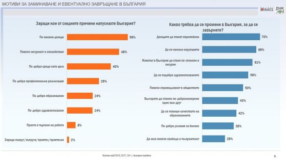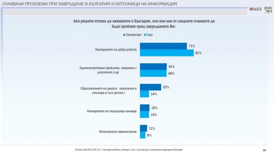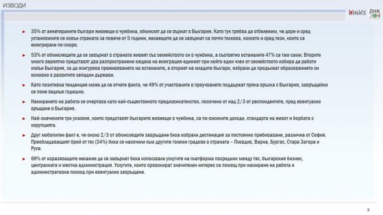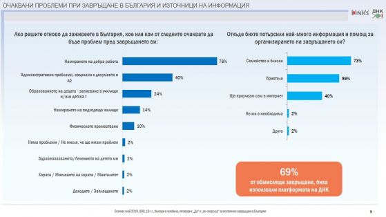„ Най-значимите три условия за завръщане, които показват българите, живеещи в чужбина, са по-високите приходи, стандарта на живот и битката с корупцията . Намирането на работа се обрисува като най-същественото предизвикателство, посочено от над 2/3 от респондентите, пред вероятно връщане в България. Друг любопитен факт е, че 63% от обмислящите завръщане биха избрали дестинация за непрекъснато престояване, друга от София. Преобладаващият брой от тях (34%) биха се насочили към другите огромни градове в страната – Пловдив, Варна, Бургас, Стара Загора и Русе “, разяснява Добромир Живков от Маркет ЛИНКС.