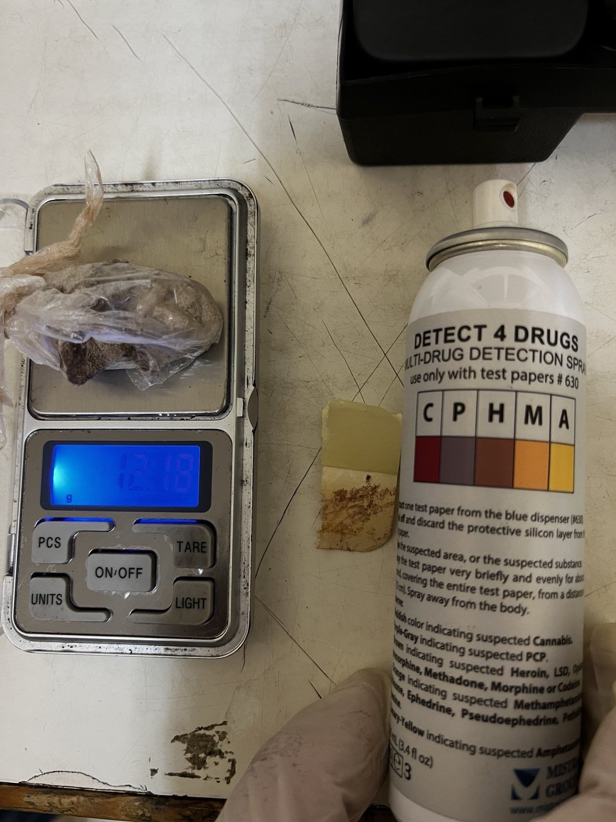 Два часа по-късно, след медицински операции, съумява да изплюе плика. При осъществен полеви тест е открито, че в него има 12,80 грама хероин и метаамфетамин.