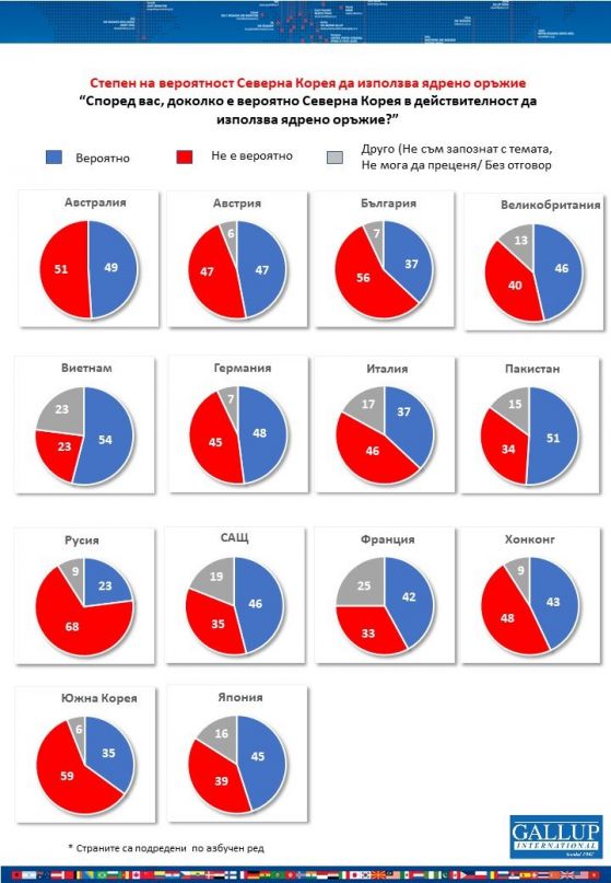 Данните на световно равнище: 43% от интервюираните имат вяра, че е евентуално Северна Корея да доближи в дейностите си до потребление на нуклеарно оръжие, а 46% са на противоположното мнение.