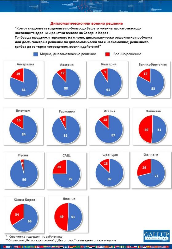 91% от българските респонденти са на мнение, че би трябвало да продължи търсенето на спокойно, дипломатическо решение на рецесията в Северна Корея.