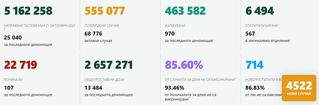 Общо 2 657 271 са поставените у нас дози от имунизациите против COVID-19 досега. 13 484 от тях са приложени през миналото денонощие. Според Националната осведомителна система медицинските чиновници, при които е потвърден новият ковид у нас, са общо 15 258. Нови 40 случая са регистрирани през последното денонощие. 22 719 са умрелите лица, при които е била установена корнавирусната зараза. 107 нови случая са регистрирани през последните 24 часа. 93,46 % от умрелите лица не са били имунизирани. Само за трите минали денонощия на тази седмица у нас са регистрирани нови 14458 случая на COVID-19. Седмица по-рано за същия интервал новодиагностицираните лица бяха 10267.