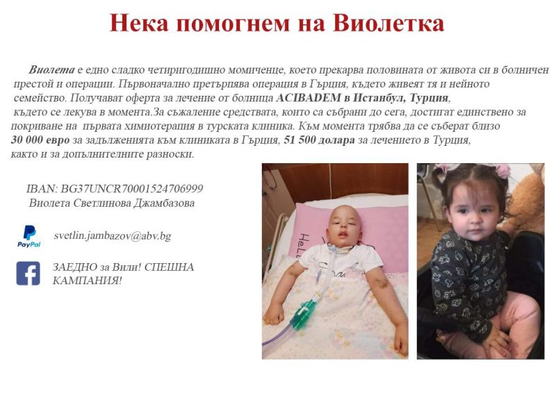 Затова в обществените мрежи е проведена акция в поддръжка на Виолета, като задачата е да се съберат както оставащите средства за лекуването в Истанбул, по този начин и за отговорностите към гръцката клиника, които все още са към 30.000€.