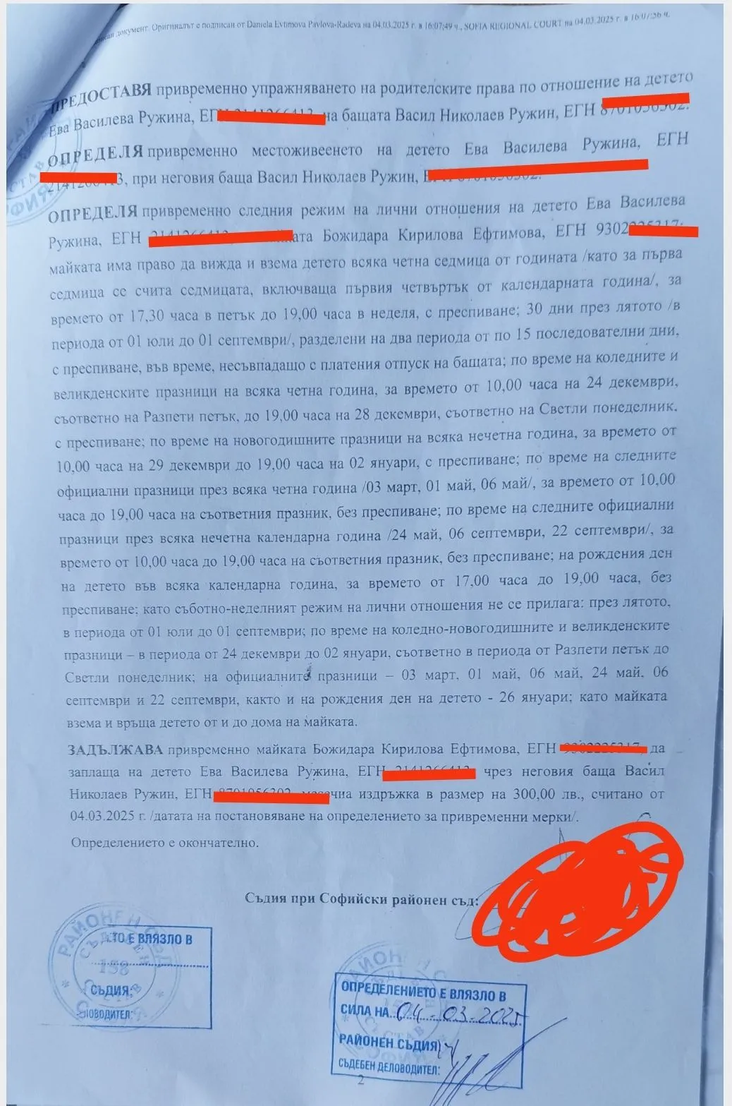 " Четири месеца, откато Васил Ружин отхвърля да даде детето на майка ѝ и даже да се срещнем на публично място. Четири месеца, в които той принудително разделя едно дете от майка ѝ, употребявайки я като средство за надзор и операция.