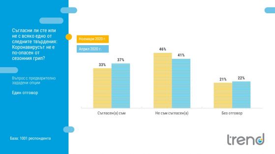 Една трета от българите са на мнение, че коронавирусът не е по-опасен от сезонния грип. С увеличението на възрастта понижава делът на хората, които са съгласни с това изказване.