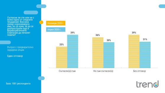 Темата с имунизациите е изключително настояща през последните седмици в резултат на първите ефикасни ваксини против ковид. Една четвърт (25%) от българите през ноември месец са на мнение, че ваксина има, само че се крие, с цел да се популяризира още повече заболяването и фармацевтичните компании да печелят повече. През месец април съгласните с това са били 39%.