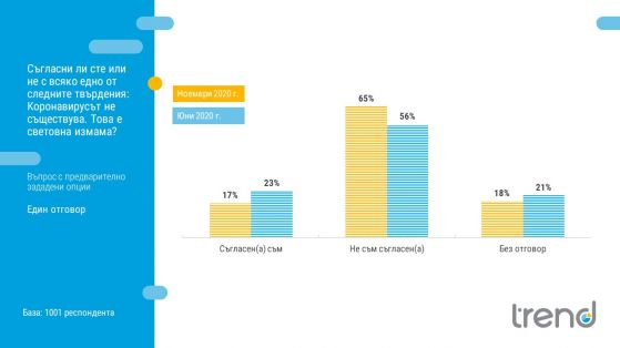 Това демонстрират данни от изследване на „ Тренд " по поръчка на 24 часа за настройките на българите по отношение на тайни теории към COVID-19. Проучването е осъществено в интервала сред 2-10 ноември посредством изявленията " лице в лице " измежду 1001 души.