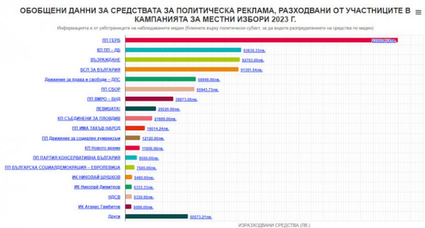 40 от партиите, записали се за локалния избор, са похарчили 830 хиляди лева за медийна реклама в границите на първите 10 дни от акцията. Това демонстрира разбор на Института за развиване на обществената среда.
