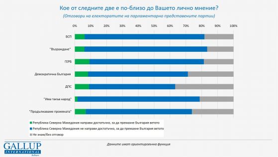 62,8% от пълнолетните българи считат, че Северна Македония не е направила задоволително България да отстрани ветото. Под една десета считат, че РСМ е направила задоволително. Данните затвърждават наблюденията, че позицията на българското общество по тематиката остава твърда и непроменена. Това са обичайните равнища по тези въпроси.