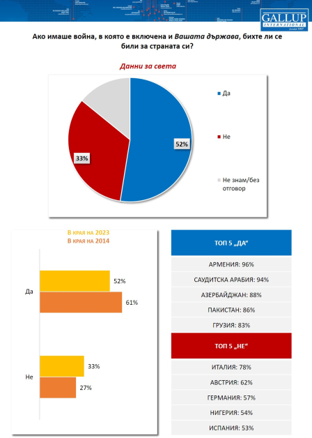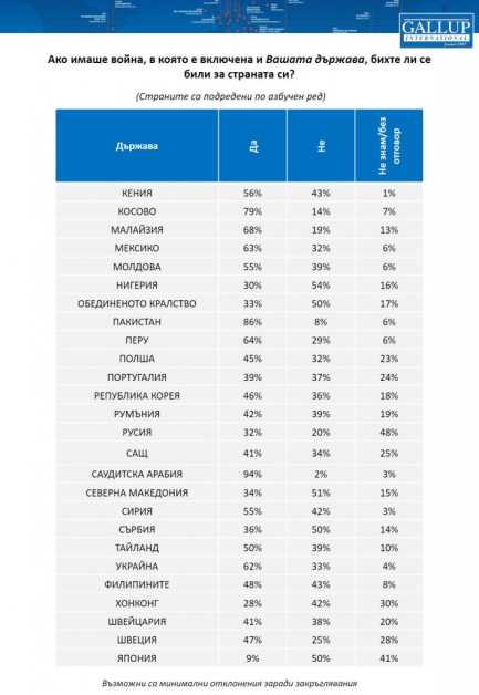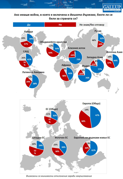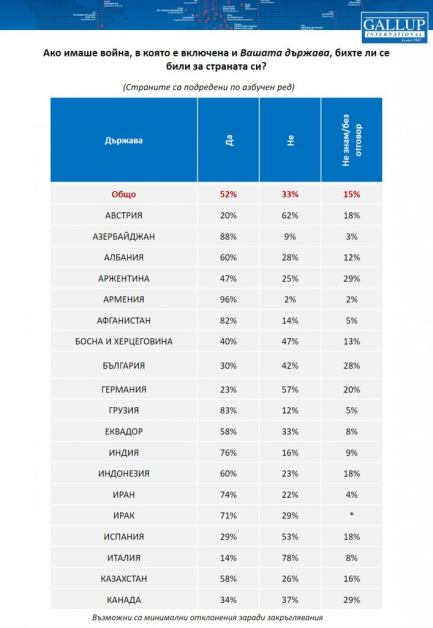 42% от българите не биха се сражавали за страната си. 30% от жителите биха отишли на фронта, а 28 % настояват, че не знаят по какъв начин биха постъпили в случай че избухне война. Всеки втори по света декларира, че ако има война, би се сражавал за страната си, една трета не биха, а останалите не са сигурни. Това демонстрират резултати от ново изследване на Световната асоциация „ Галъп интернешънъл “, извършено в 45 страни по света и представително за повече от половината от международното население.
