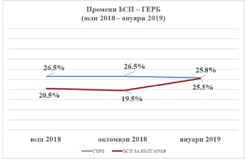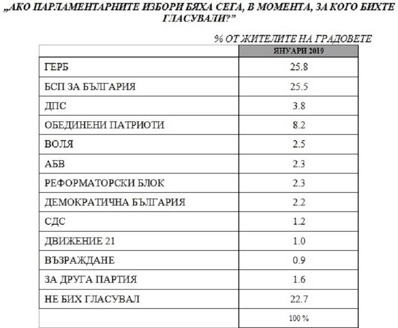 Българска социалистическа партия е застигнала ГЕРБ и все още, в градовете. Двете водещи партии са с изцяло подравнен електорален капацитет, надлежно 25.5% и 25.8%. Подкрепата за Движение за права и свободи е 9,5%, а за " Обединени патриоти " - 7,1 на 100.