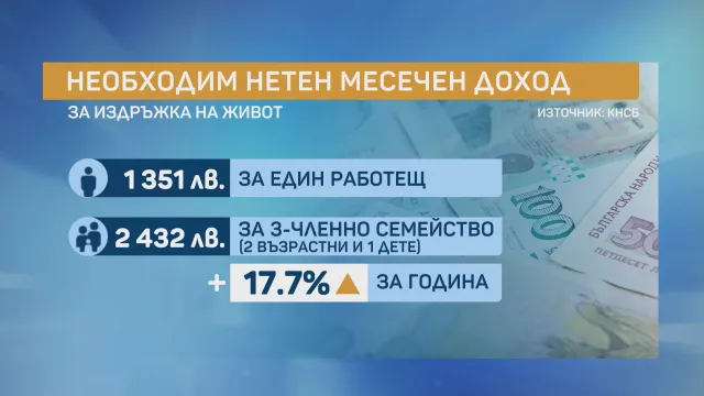 Тя добави, че на едно тричленно семейство са му нужни 2432 лева, с цел да може да живее обикновено. “За една година това е растеж от 17,7%. Близо ⅔ от осигуряващите се лица по трудовоправни връзки не могат да си разрешат заплата за прехрана в размер на 1741 лева за работещ ”, счита Иванова.