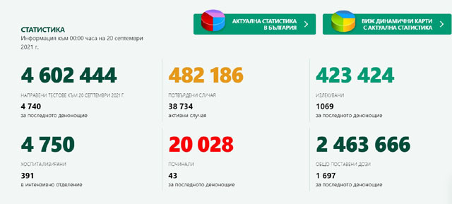 458 нови инфектирани - 9,6% от изследваните в неделя Починалите от ковид у нас трансферираха психическа граница - към този момент са 20028. През последното денонощие са умряли още 43-има по данни на Единния информативен портал. 458 нови инфектирани с ковид са регистрирани в България в неделя. Те са 9,6% от всички изследвани. Направени са 4740 теста. От тях 1180 са PCR, а 3560 - бързи антигенни.