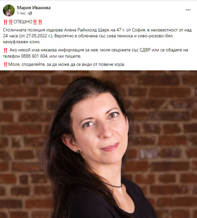 47-годишна IT специалистка беше оповестена за търсене. Алена Щерк е изчезнала през вчерашния ден и от този момент околните ѝ нямат връзка с нея.