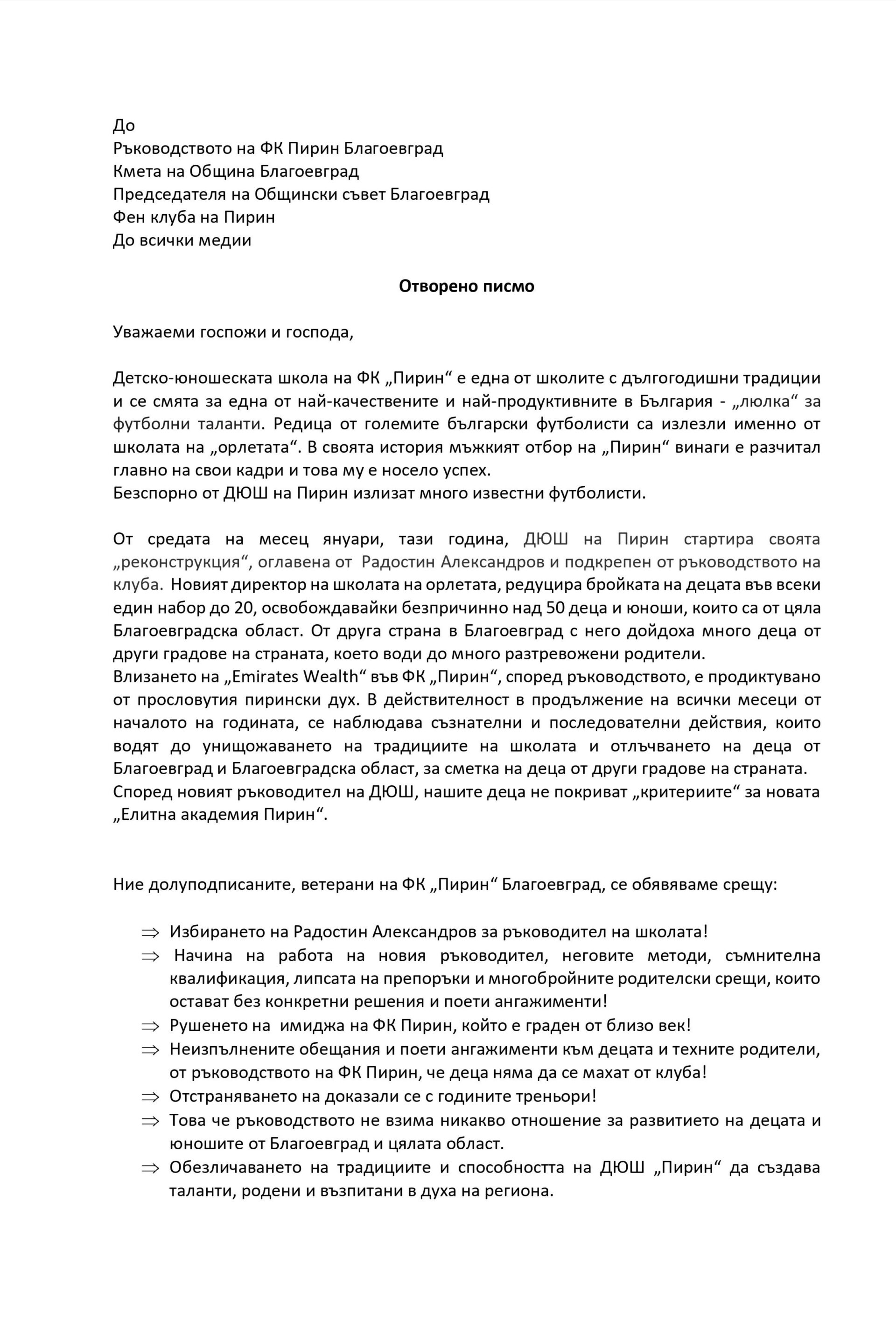 47 от ветераните на ФК Пирин се подписаха в отворено писмо, в което показват остро противоречие със протичащото се в ДЮШ.
