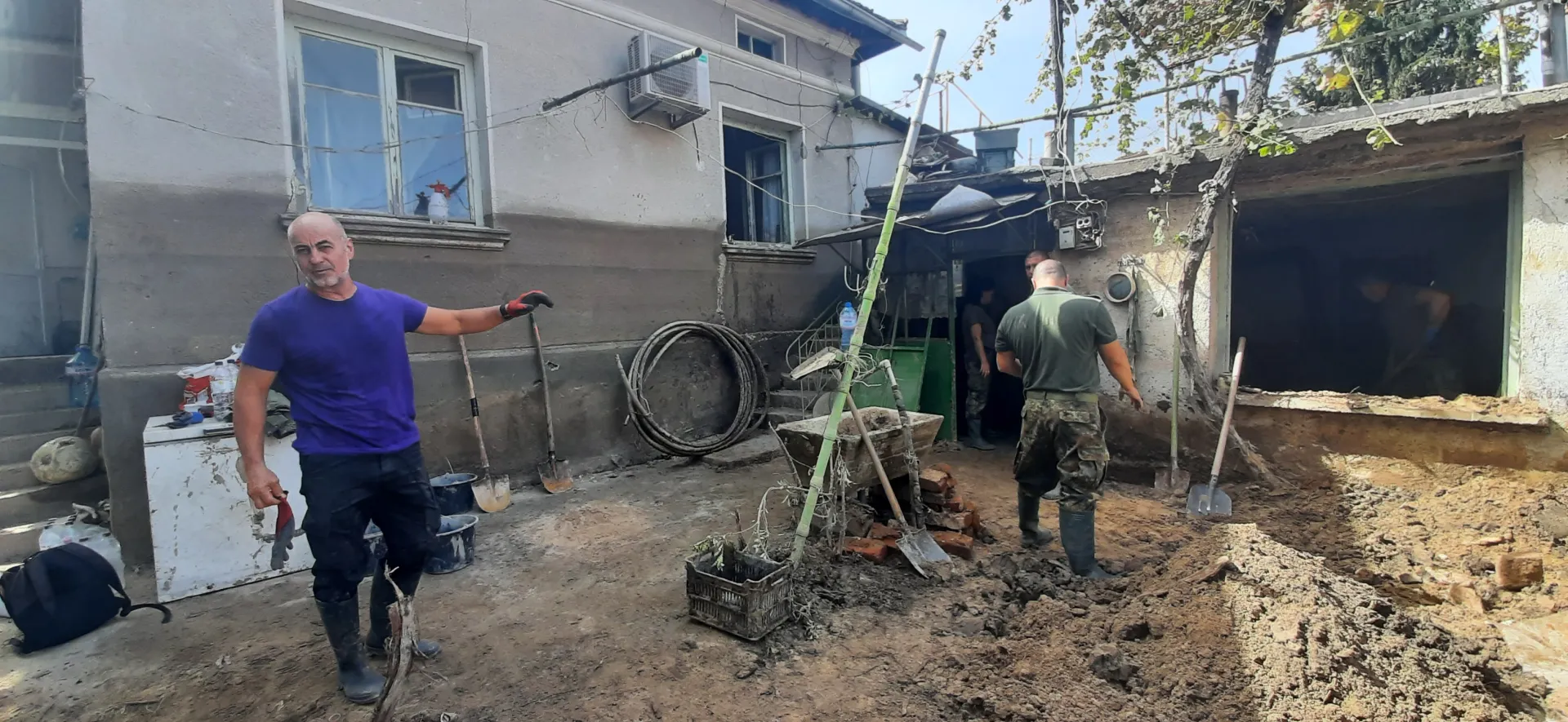 Военните са разчистили част от двора и къщата на Димитър Мачев, а преди този момент са избавили 86-годишната му майка от двуметровата вълна, заляла парцела. Димитър живее от 9 години в Англия и е взел отпуск, с цел да възвърне бащината си къща.